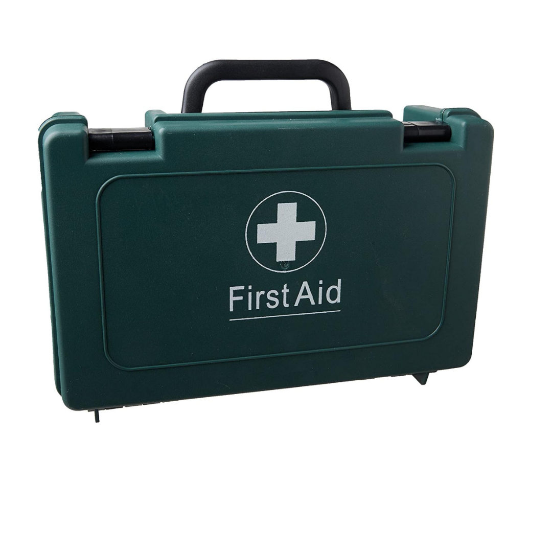 First aid kit in a durable plastic box with carrying handle
